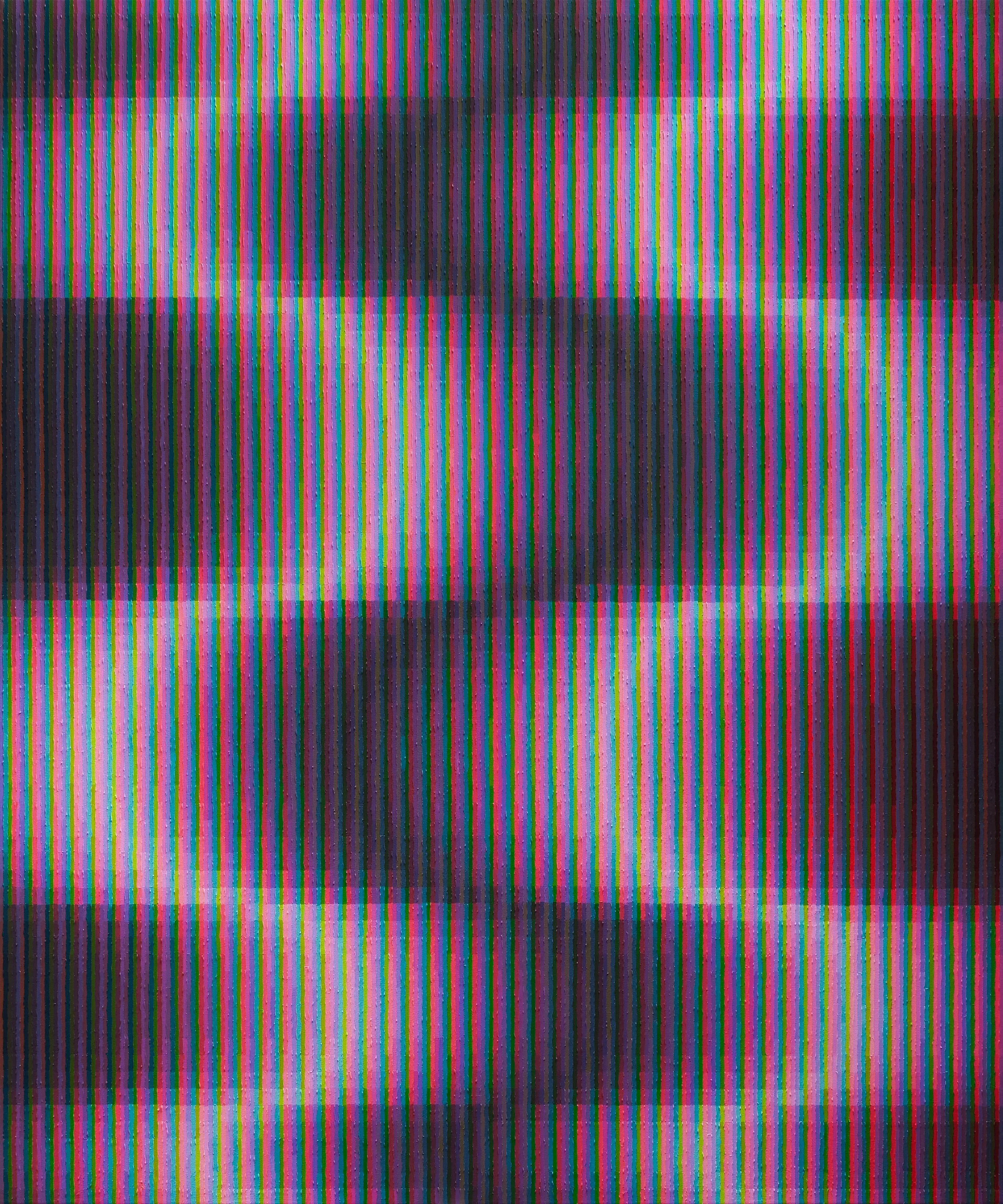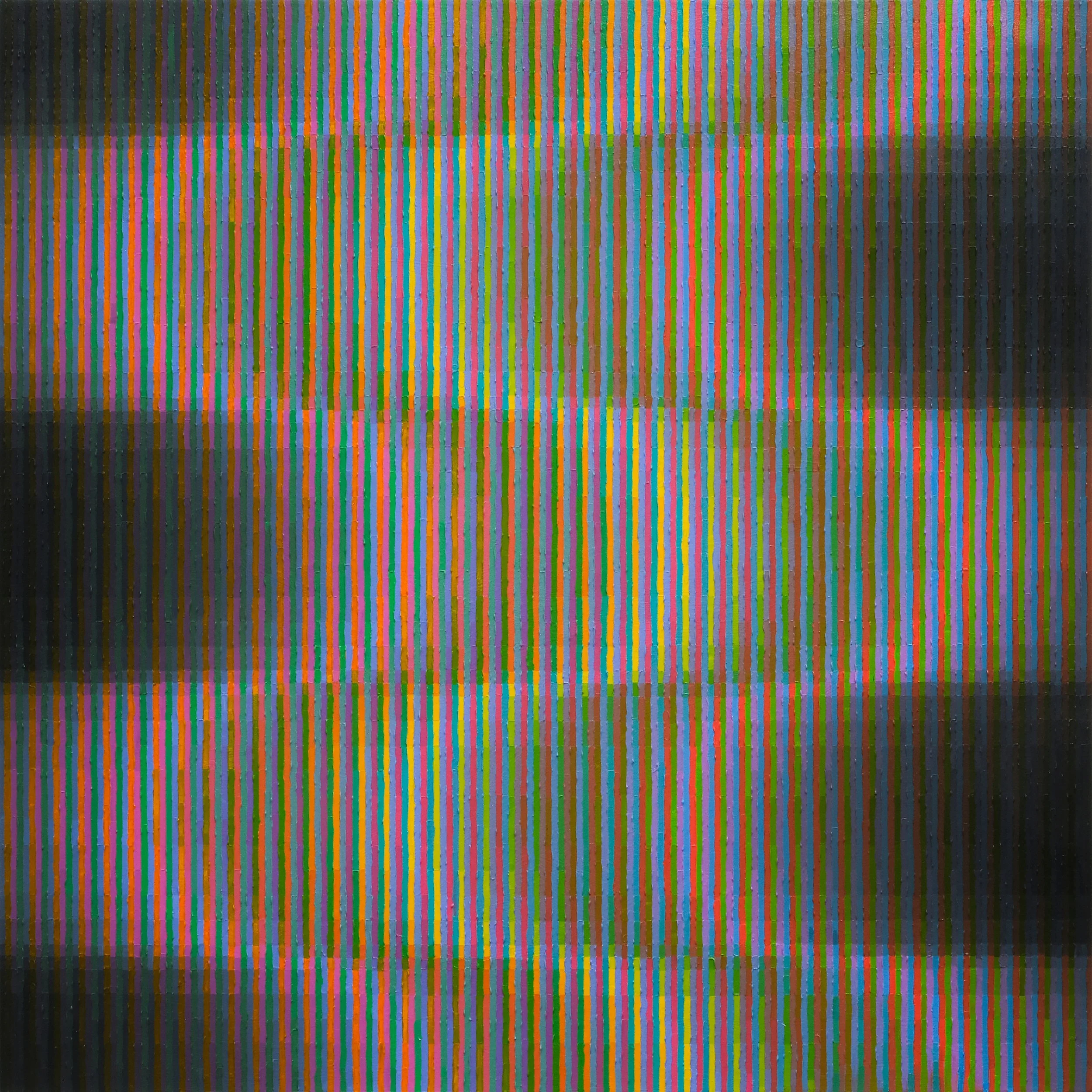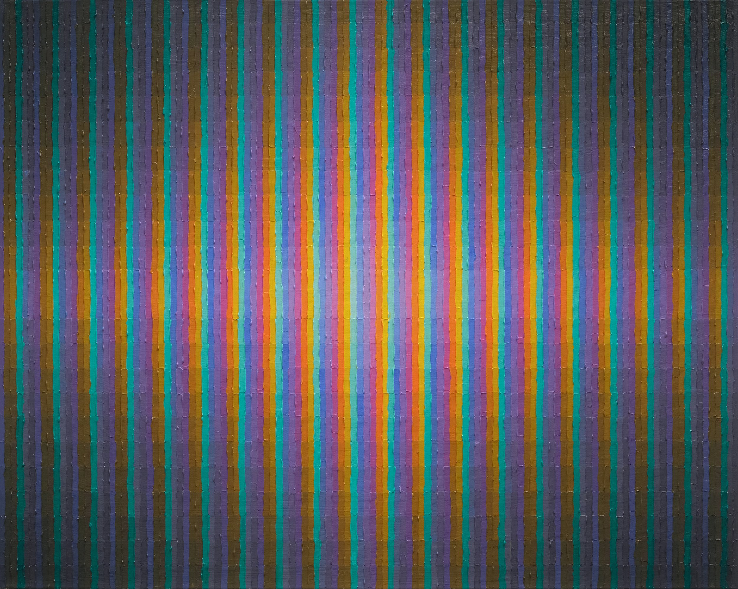 Ex Nihilo, ‘from nothing,’ draws from the metaphysical terrain of light phenomena, particularly on a cosmic scale: electromagnetic waves, the magnetosphere and solar winds, and atmospheric phenomena. Light, behaving as both wave and particle, echoes the optical impact of narrow lines fusing together to create a color haze between the painting and the viewer.