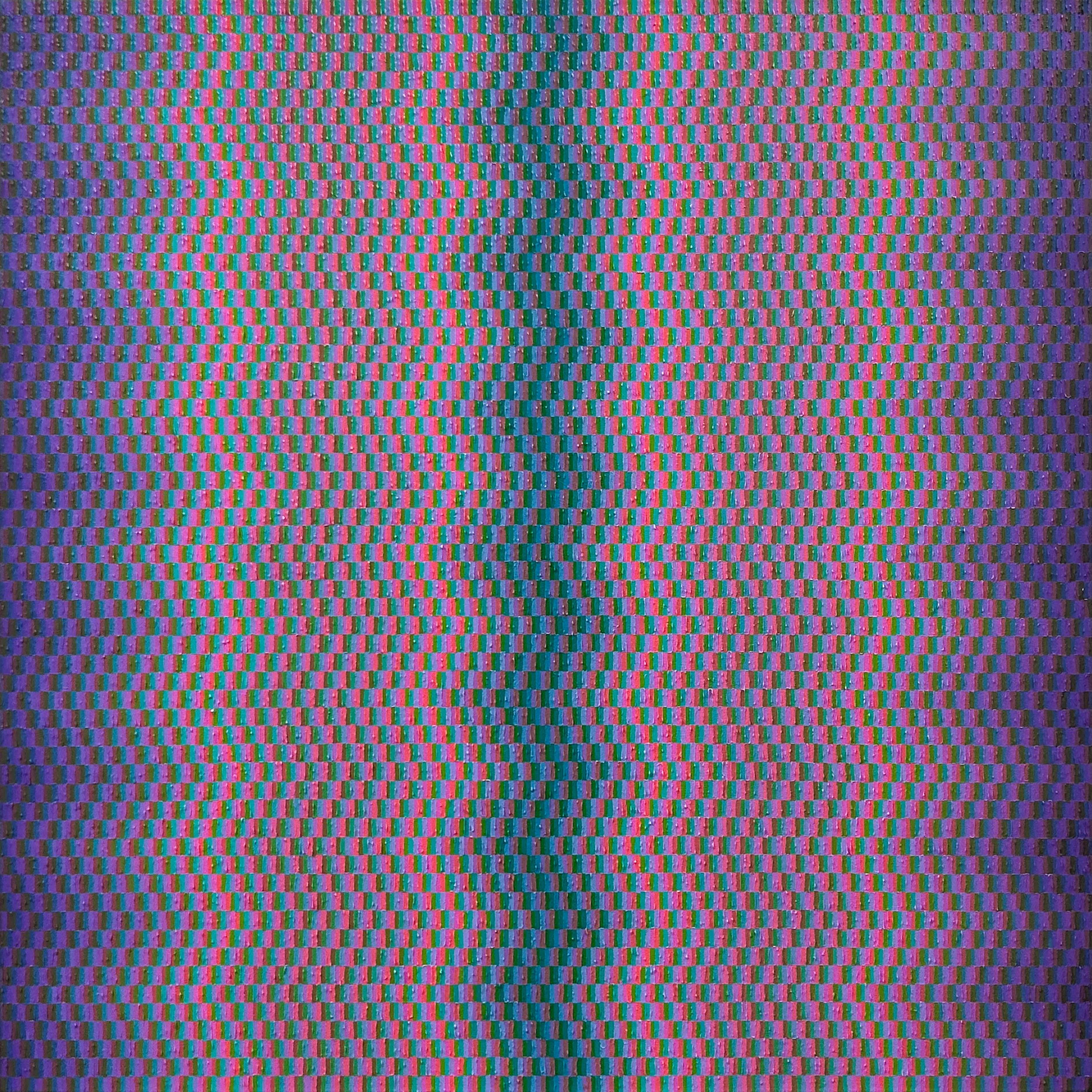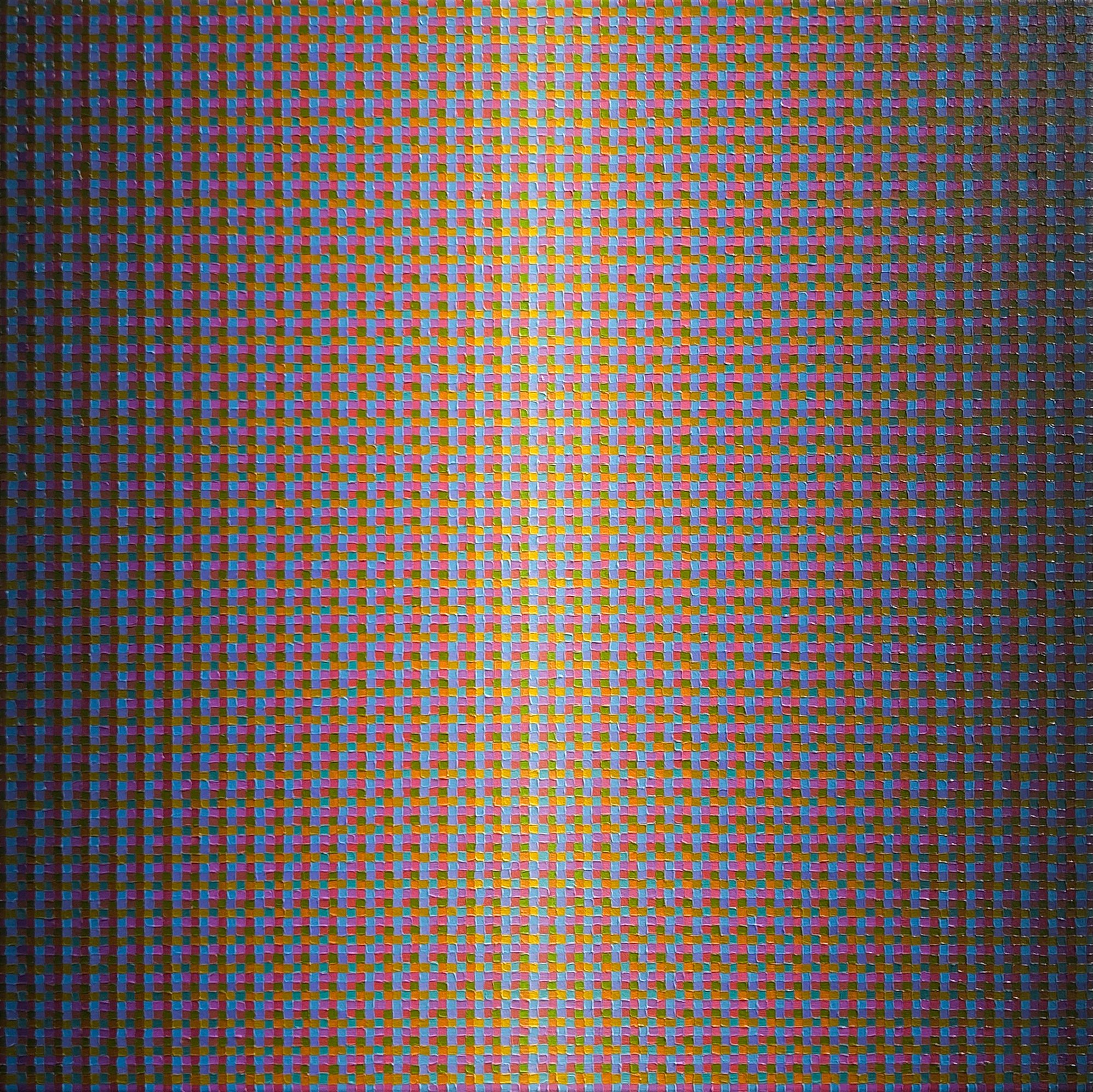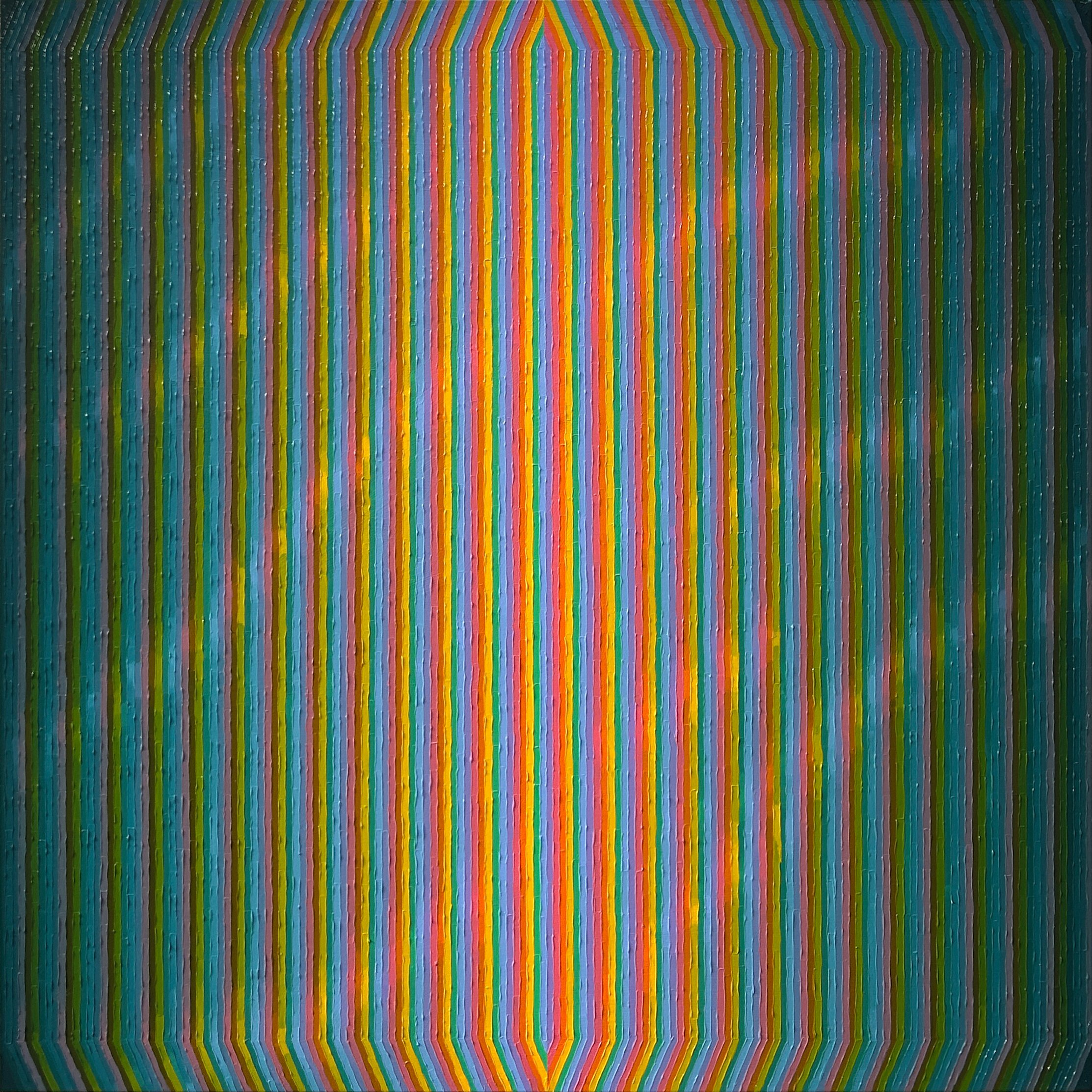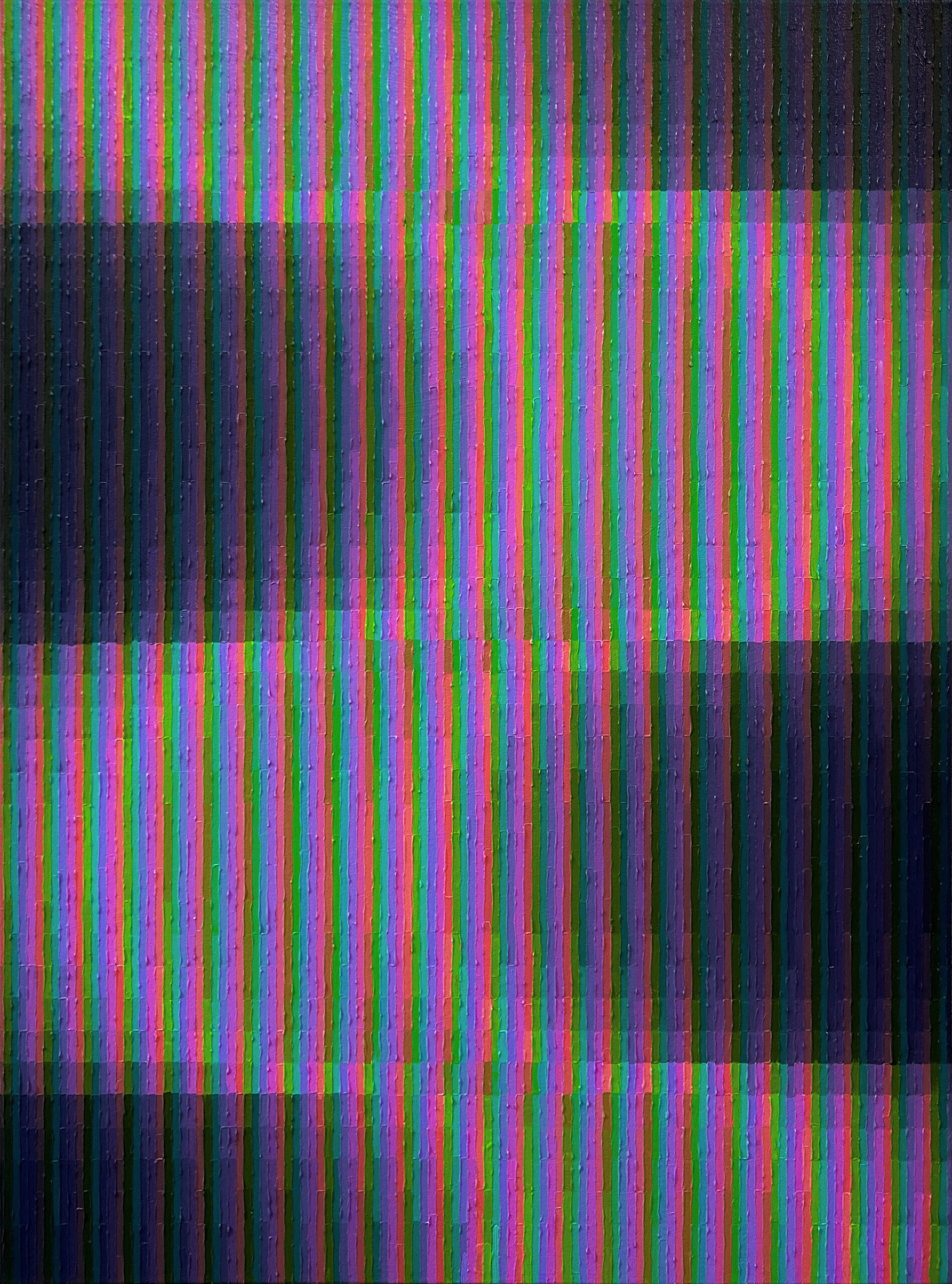 Ex Nihilo, ‘from nothing,’ draws from the metaphysical terrain of light phenomena, particularly on a cosmic scale: electromagnetic waves, the magnetosphere and solar winds, and atmospheric phenomena. Light, behaving as both wave and particle, echoes the optical impact of narrow lines fusing together to create a color haze between the painting and the viewer.